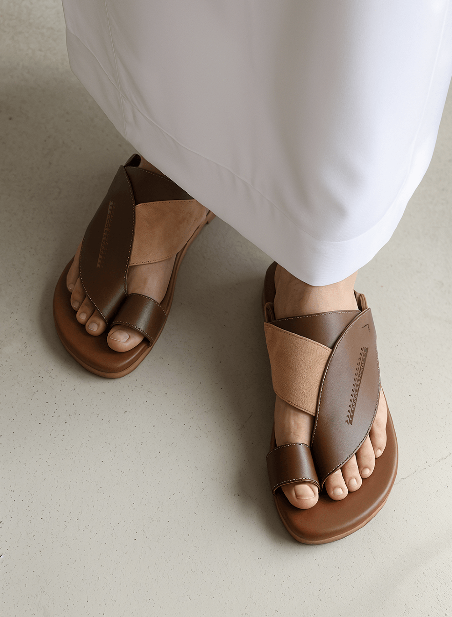 - صنادل رجالي مصنوعة من جلود فاخرة مثل جلد الإبل وجلد البقر، بالإضافة إلى خيارات 100% خالية من الجلد صديقة للبيئة.