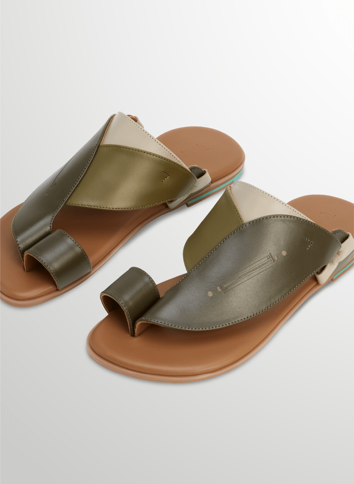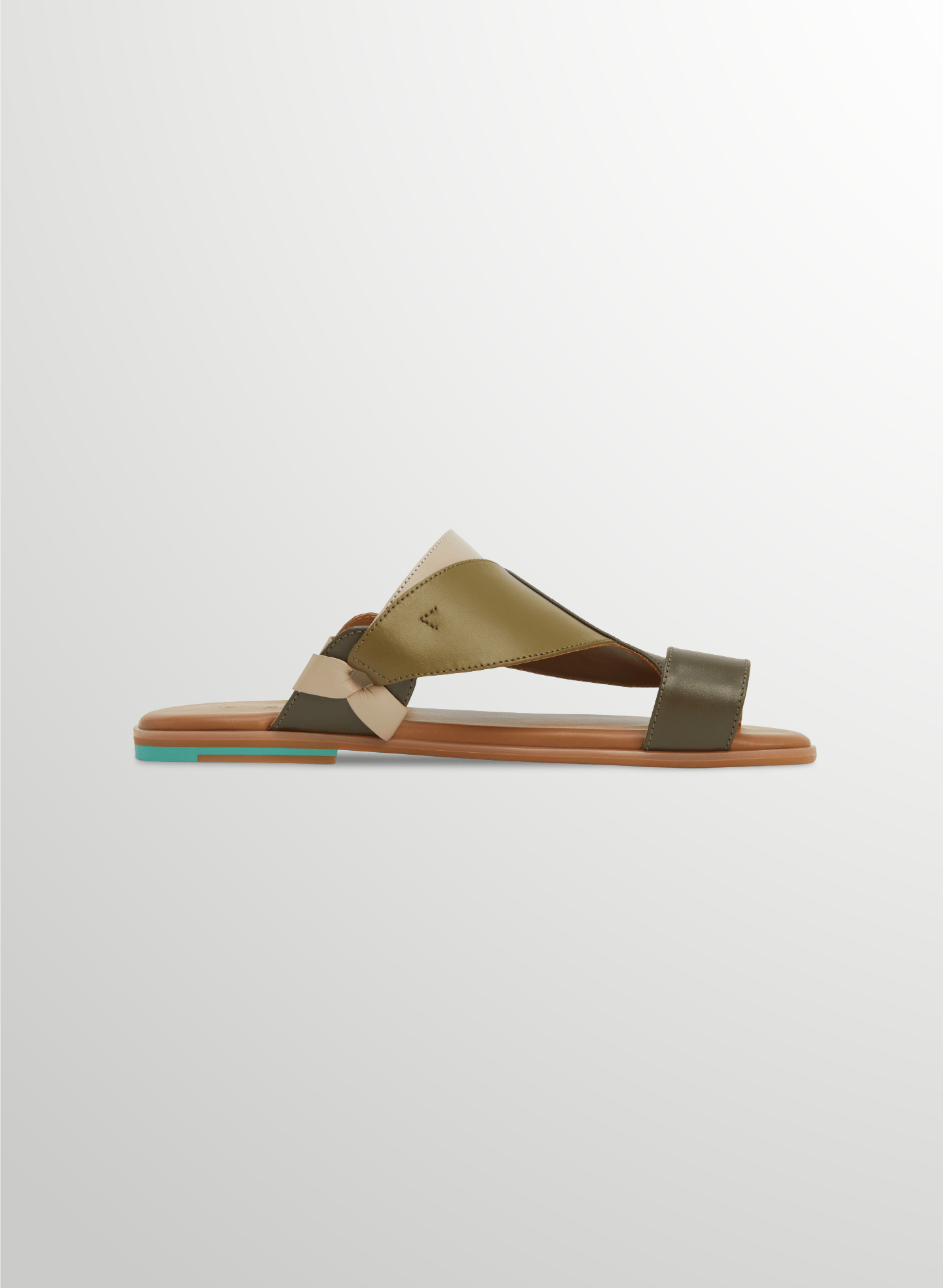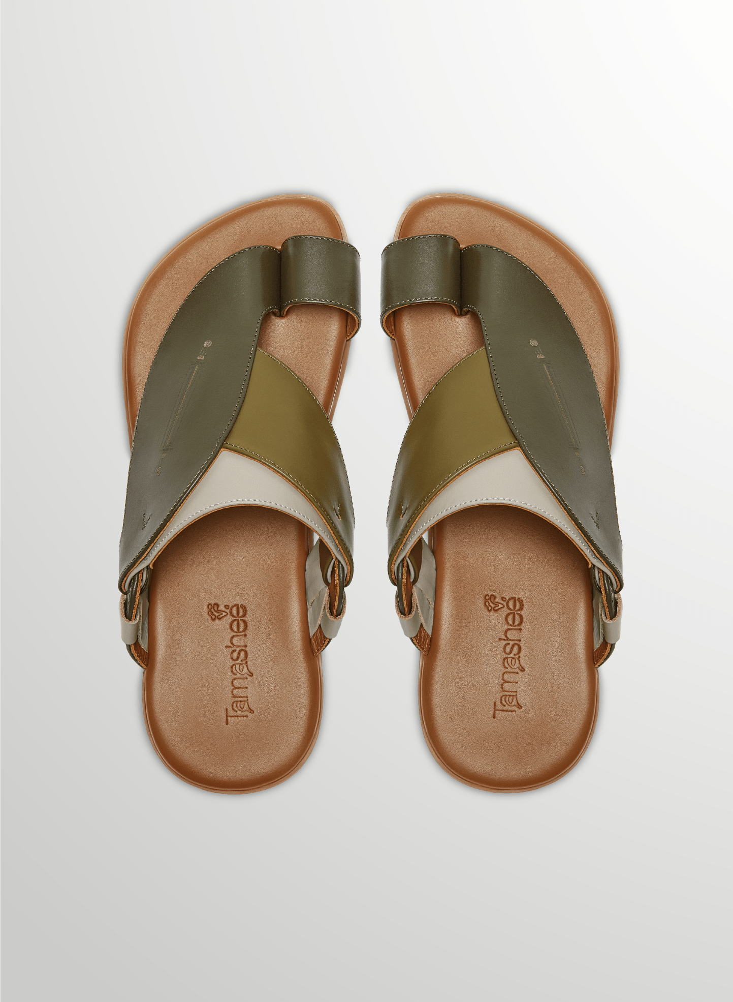 - تصميم صنادل مسطحة للرجال يسلط الضوء على مزيج من الألوان الخضراء العسكرية والأخضر الكاكي والبيج