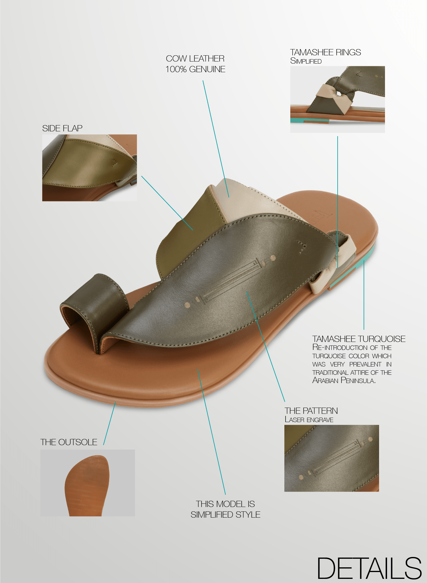 - ختم السنة الهجرية باللغة العربية. تم تخصيص هذا الختم على صنادل رجالي ليكون فقط على البطانة الداخلية في القطعة العلوية على القدم اليمنى