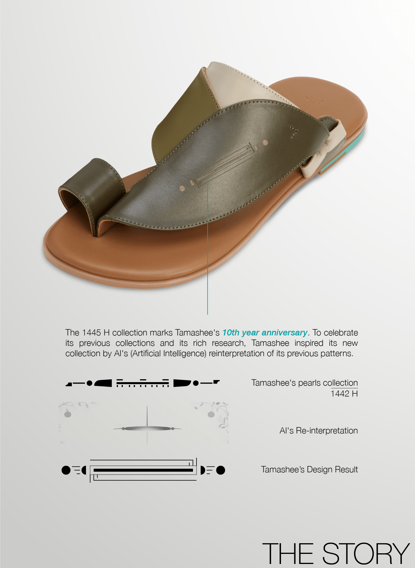 يسلط تصميم صنادل محارة ذات الغطاء الكبير للرجال الضوء على الأعمال الفنية المستوحاة من إعادة تفسير AI لمجموعة تماشي على اللؤلؤ. النمط النهائي الذي تراه على نموذج الصنادل العربية هذا هو إعادة إنشاء نهائية للعمل الفني من قبل فريق تصميم تماشي. تتضمن الميزات الرئيسية لهذا النموذج من الصنادل الرجالية ما يلي: