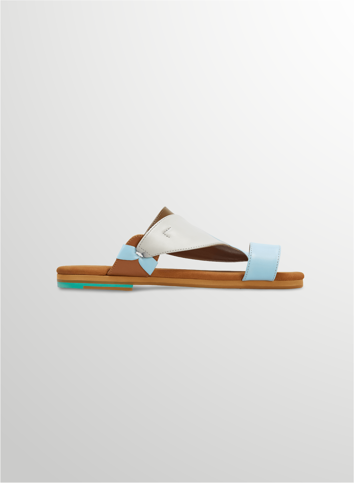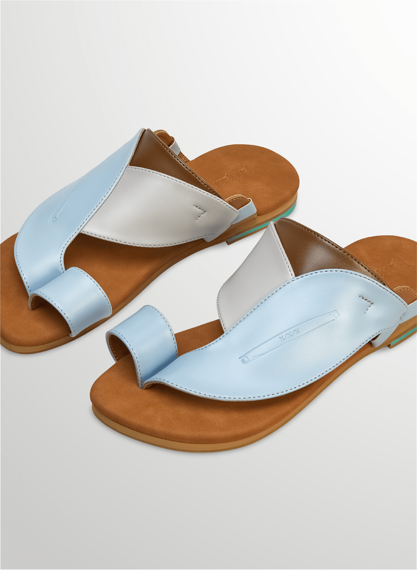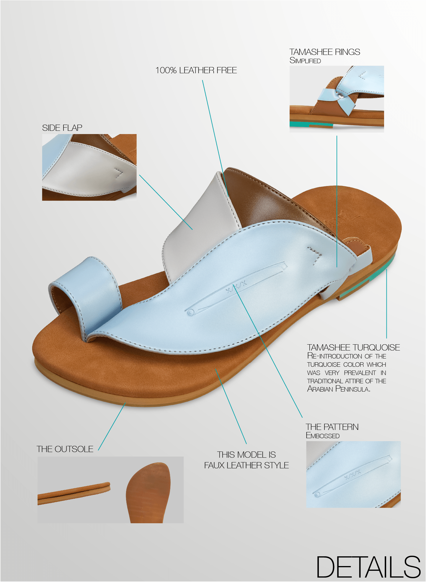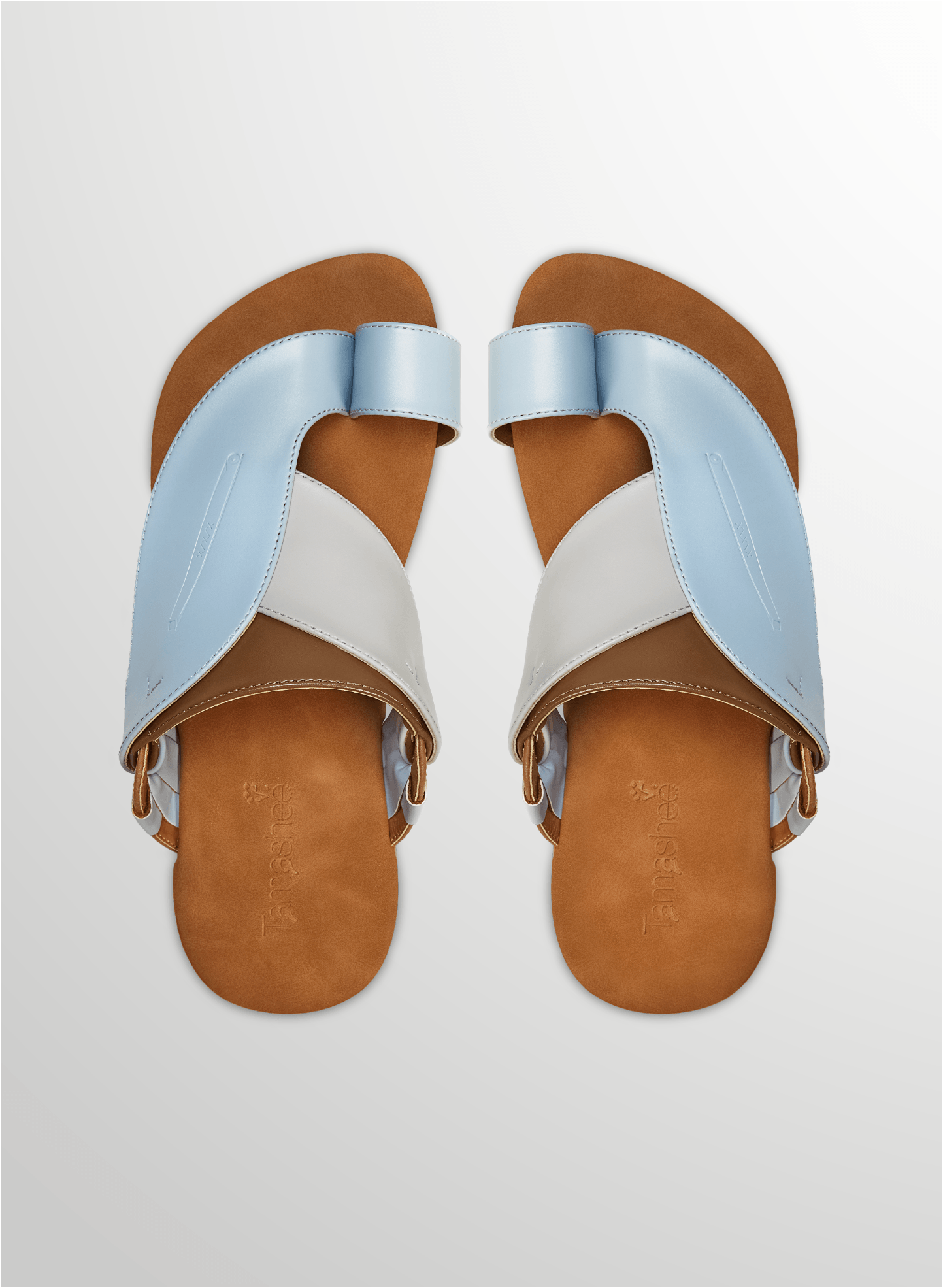 - An Arabic Sandals design highlighting a mix of light blue, light grey, and brown colors