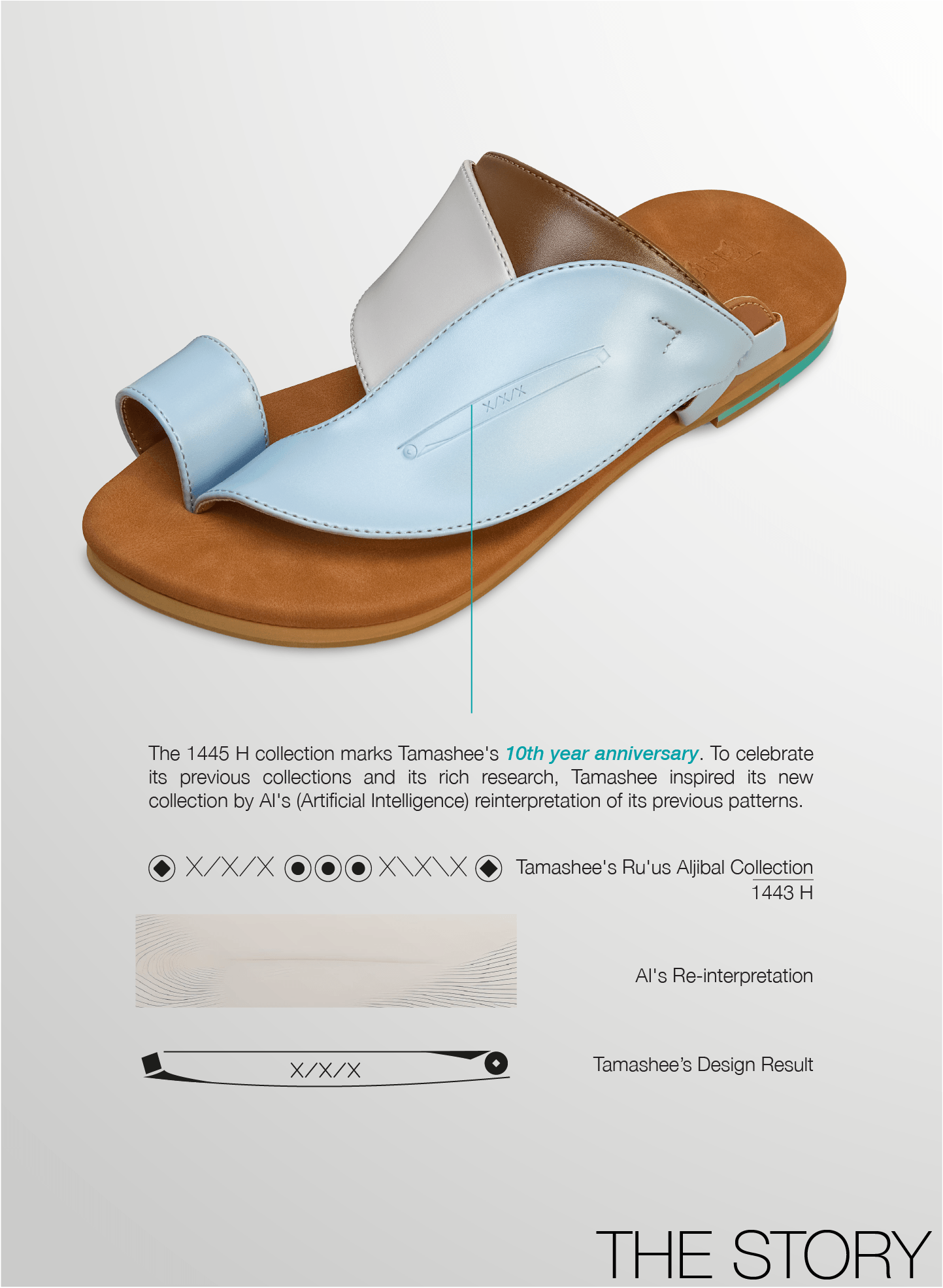 The large flap M | Madheeq Arabic Sandals for Men design highlights inspired artwork by AI’s reinterpretation of Tamashee’s collection on Ru’us Aljibal. The final pattern you see on this Sandals for Men model is the final re-creation of the artwork by Tamashee’s design team. Key features of this Men Sandals model include: