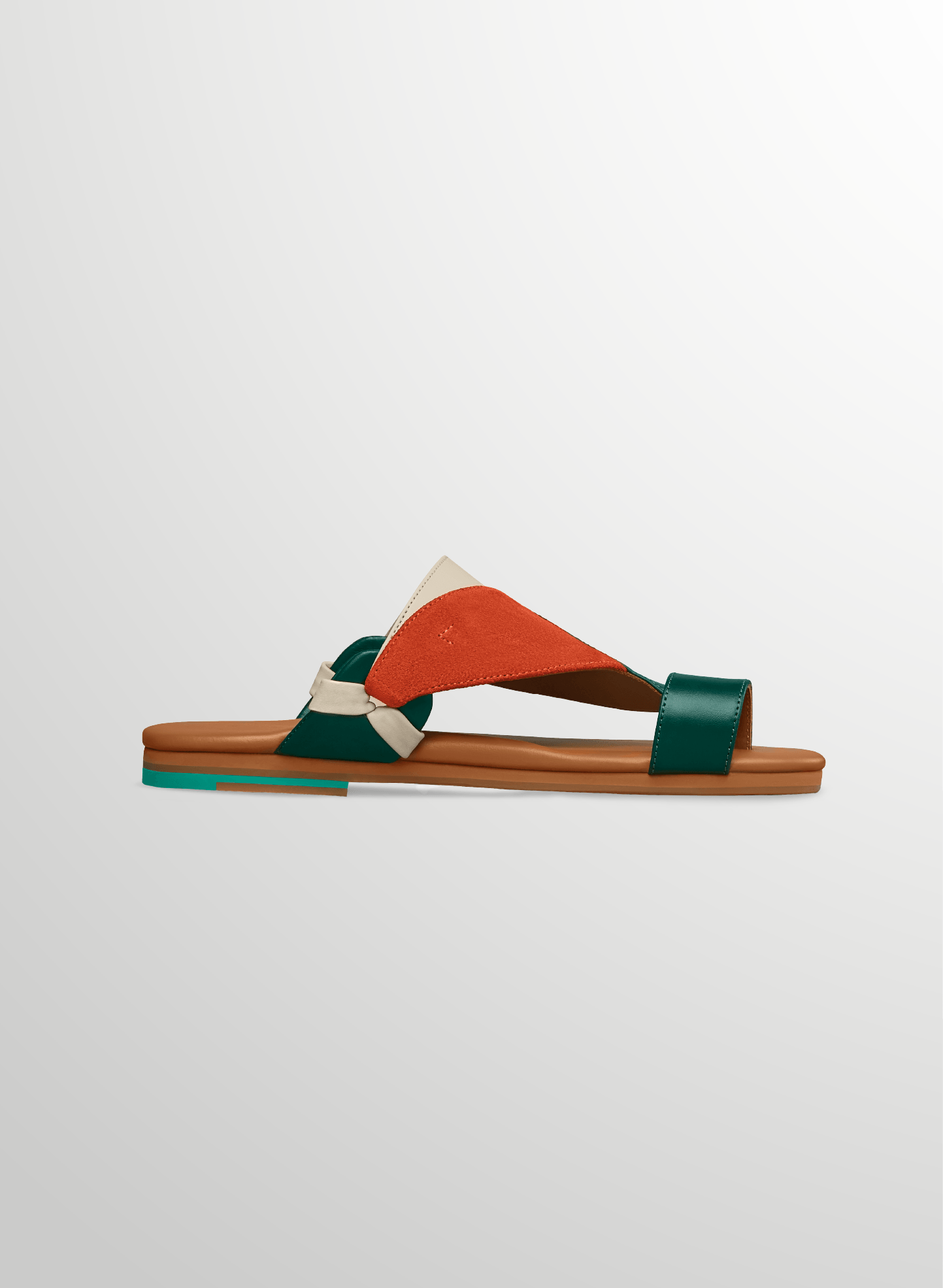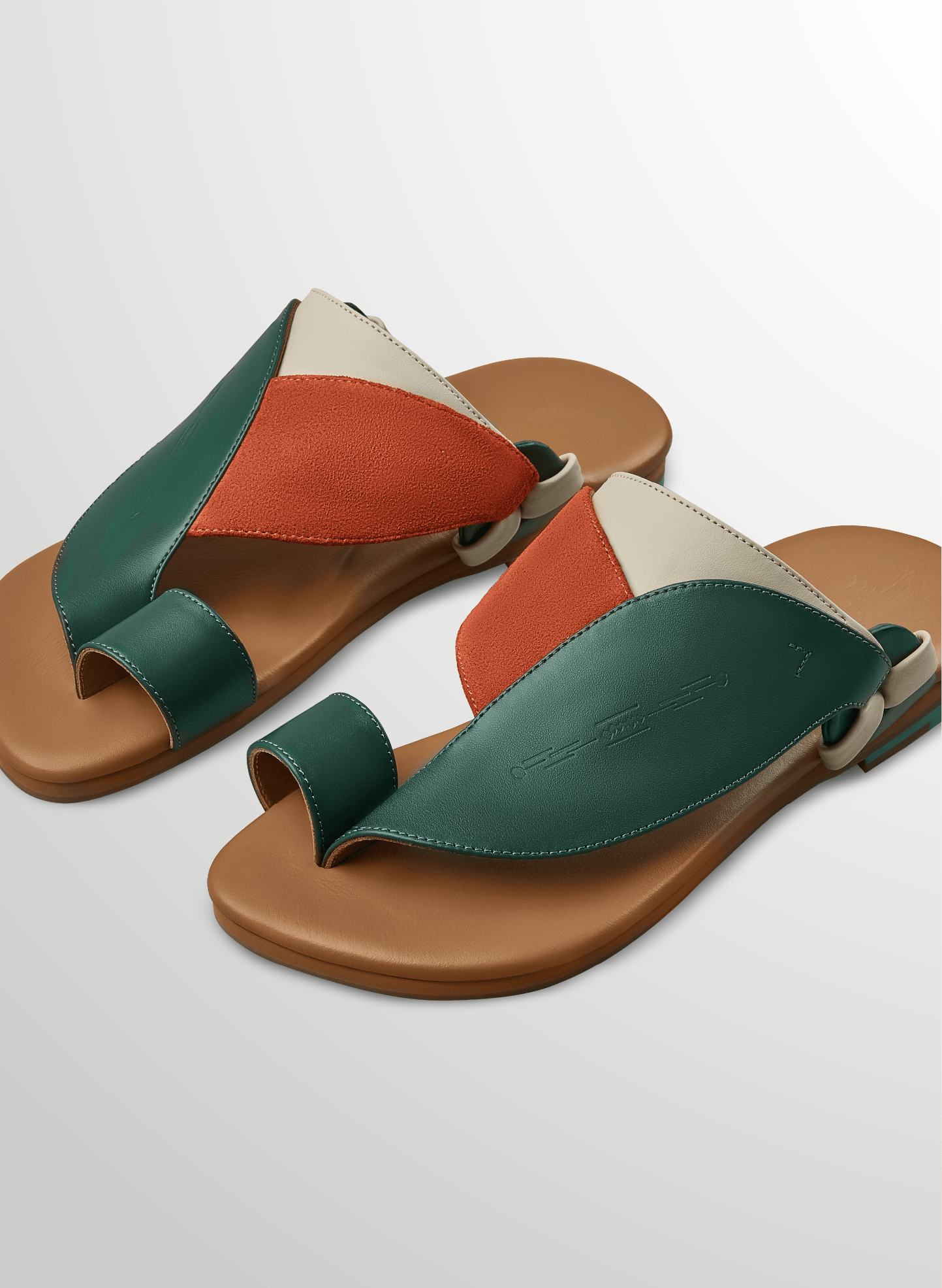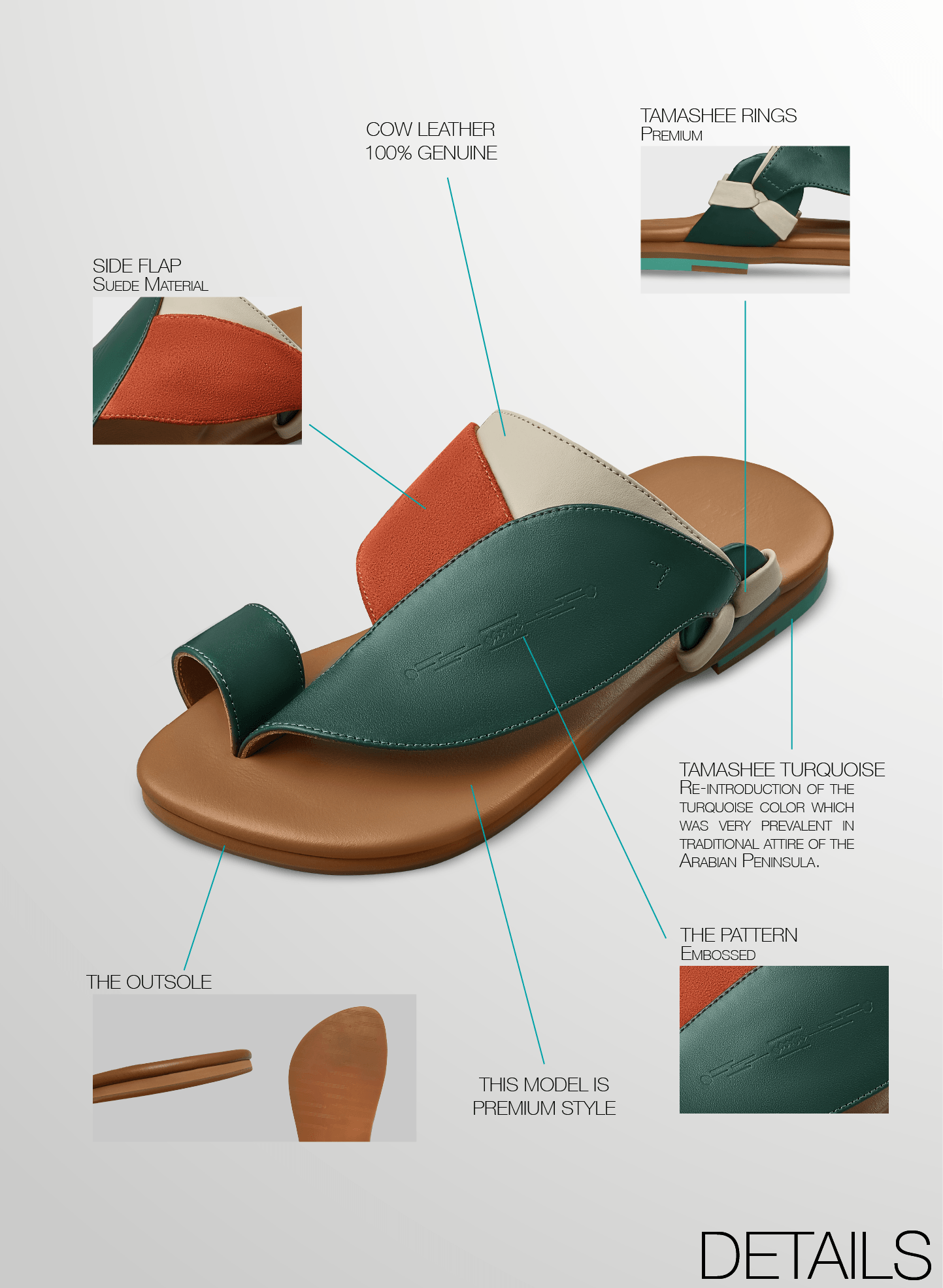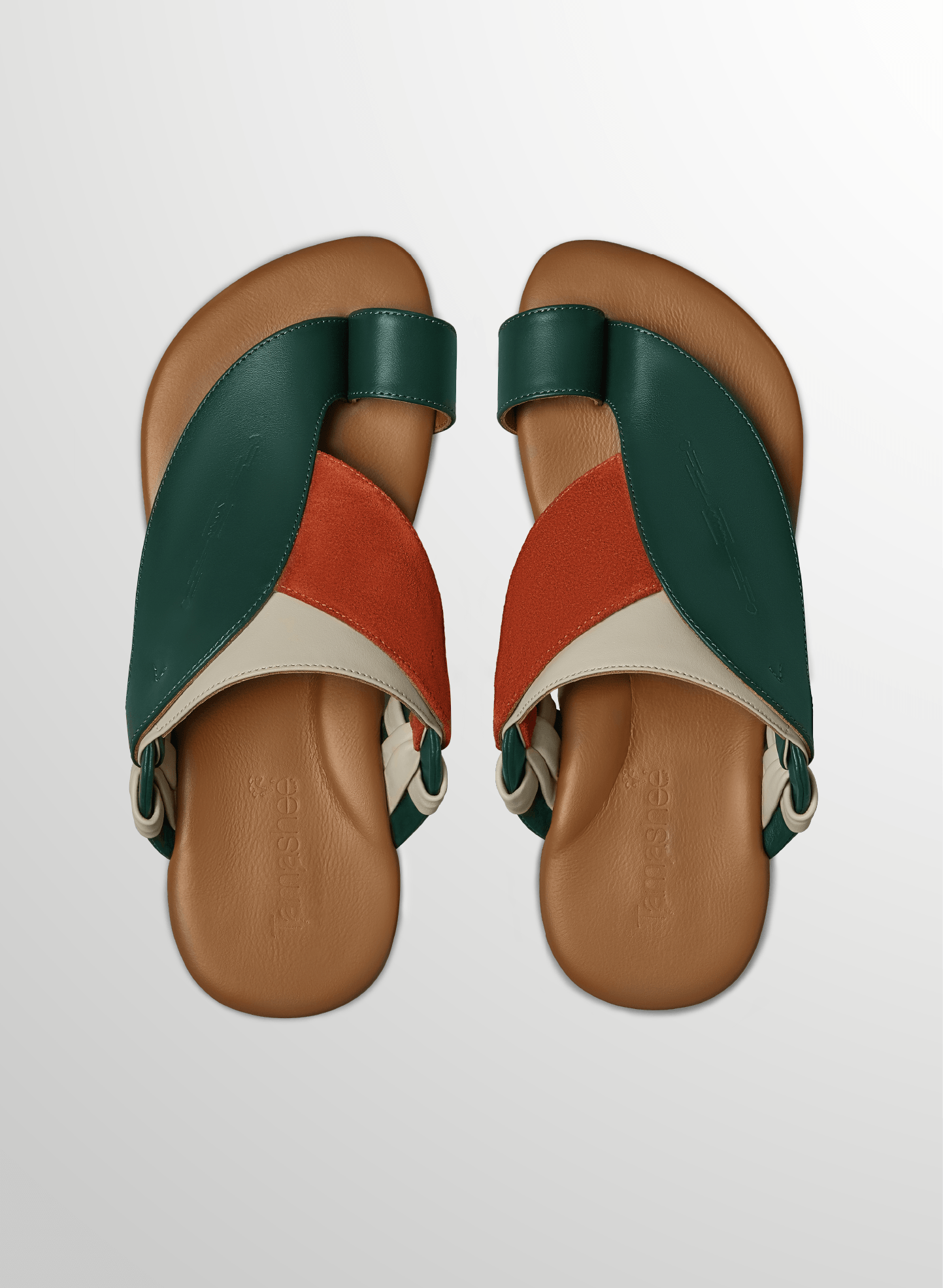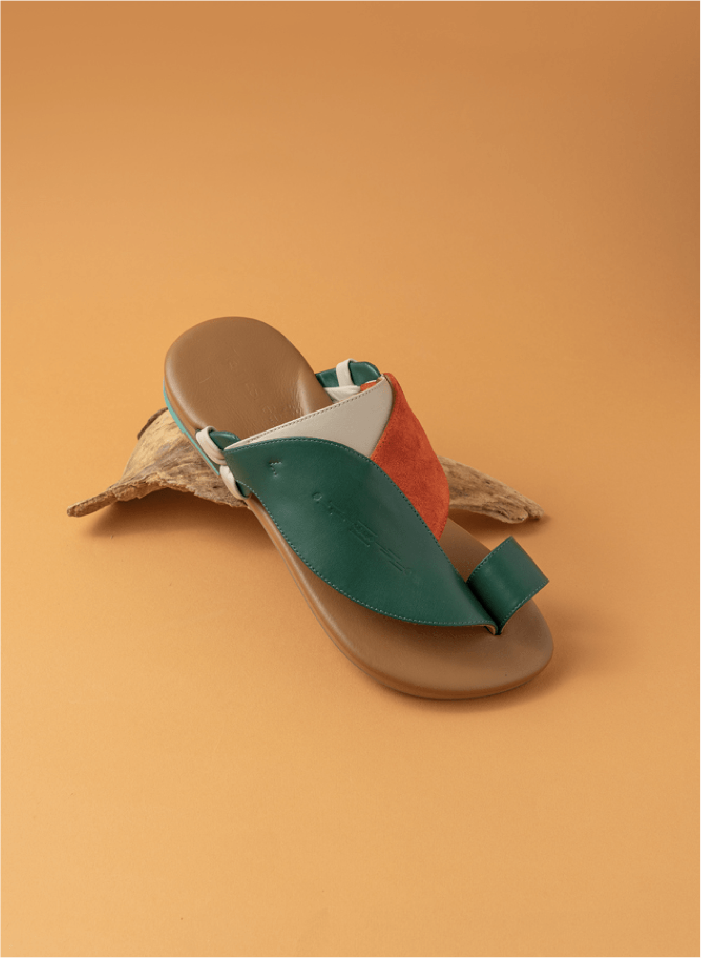 - An Arabic Sandals design highlighting a mix of dark green, orange-red, and pale beige colors