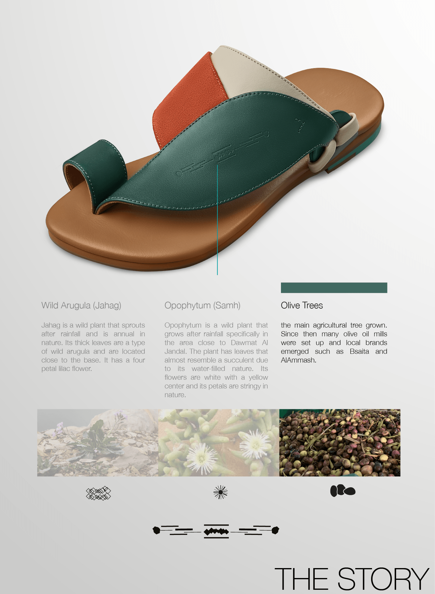 The large flap Zayton Sandals for Men design highlights a contemporary pattern inspired by some of the plants and flowers known to be common in the Al Jawf region of Northern Saudi Arabia. The Al Jawf region is known for its fertile soil and abundant water resources. As such, the area has recently become very popular for farming olive trees, wild arugula, and opophytum. The final pattern you see on this Arabian shoe, M | Zayton model, is the final re-creation of the artwork by Tamashee’s design team. Key features of this Mens Arabic Sandals model include: