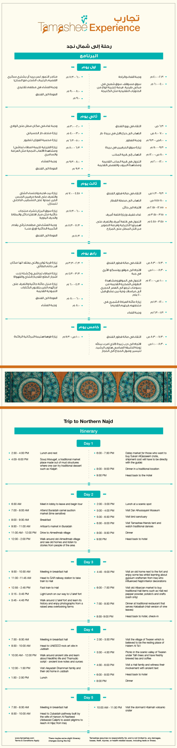 The Tamashee Experience in Northern Najd aims to visit Qassim and Hail and their neighboring landscapes whilst experiencing first-hand Northern Najd culture through its people (food, dances, clothing, etc).