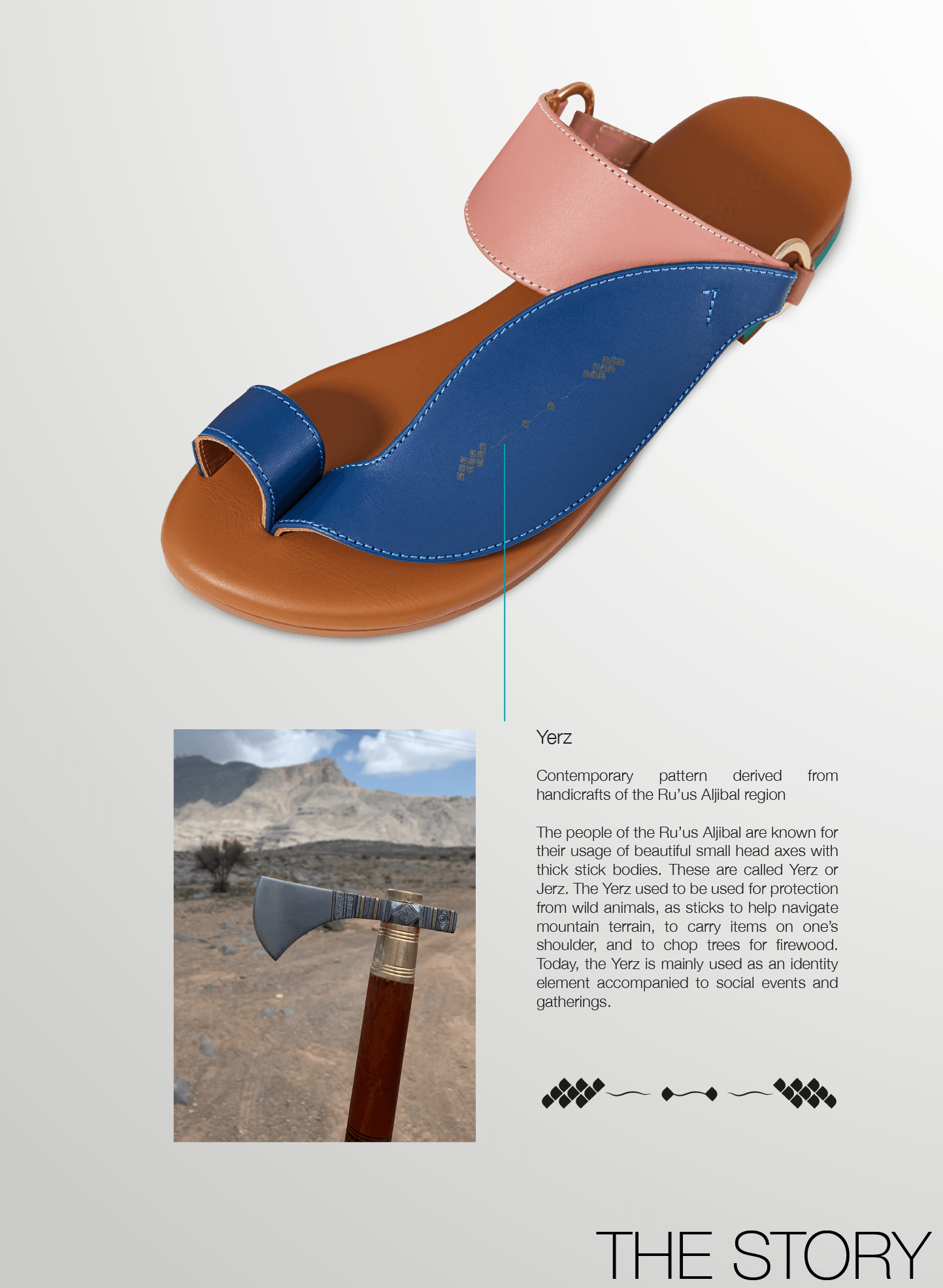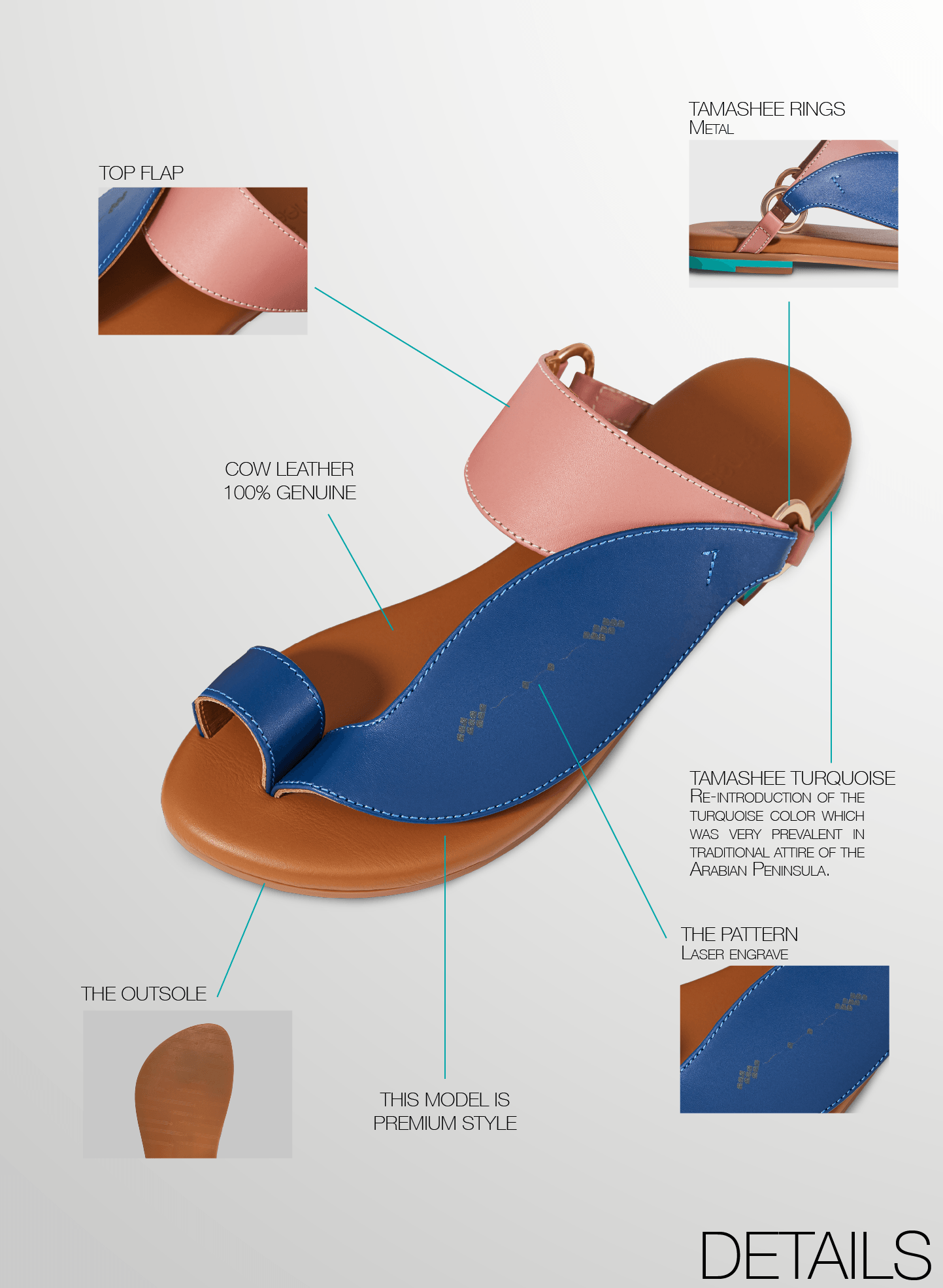 The upper is laser-engraved with a pattern derived from patterns found on traditional axes in the Ru’oos Aljibaal region. Tan colour high-end cow leather insole and tan colour high-end cow leather lining. Spongy padded insole and bottom, and rubber grip outsole. This W | Ahafeer model is part of Tamashee’s Flat Sandals Classic Line, which features metal rings. It is characterized by contemporized classic uppers similar to the traditional footwear of the Arabian Peninsula.