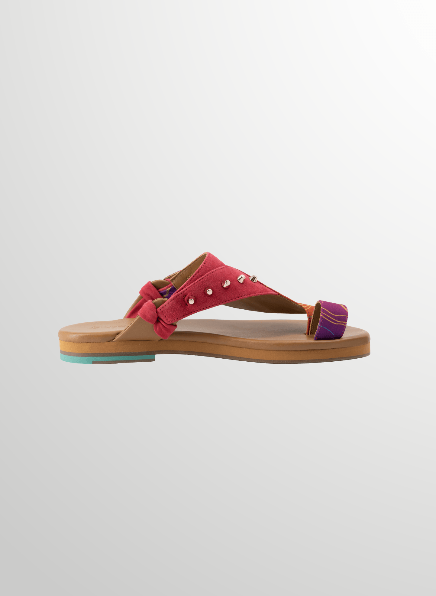 - Purple, orange gradient printed textile with rock art-inspired patterns on the upper, with more minor flaps of red suede with five copper finish studs.