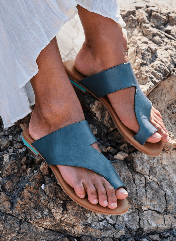 - A Flat Sandals design highlighting solid antique teal colour
